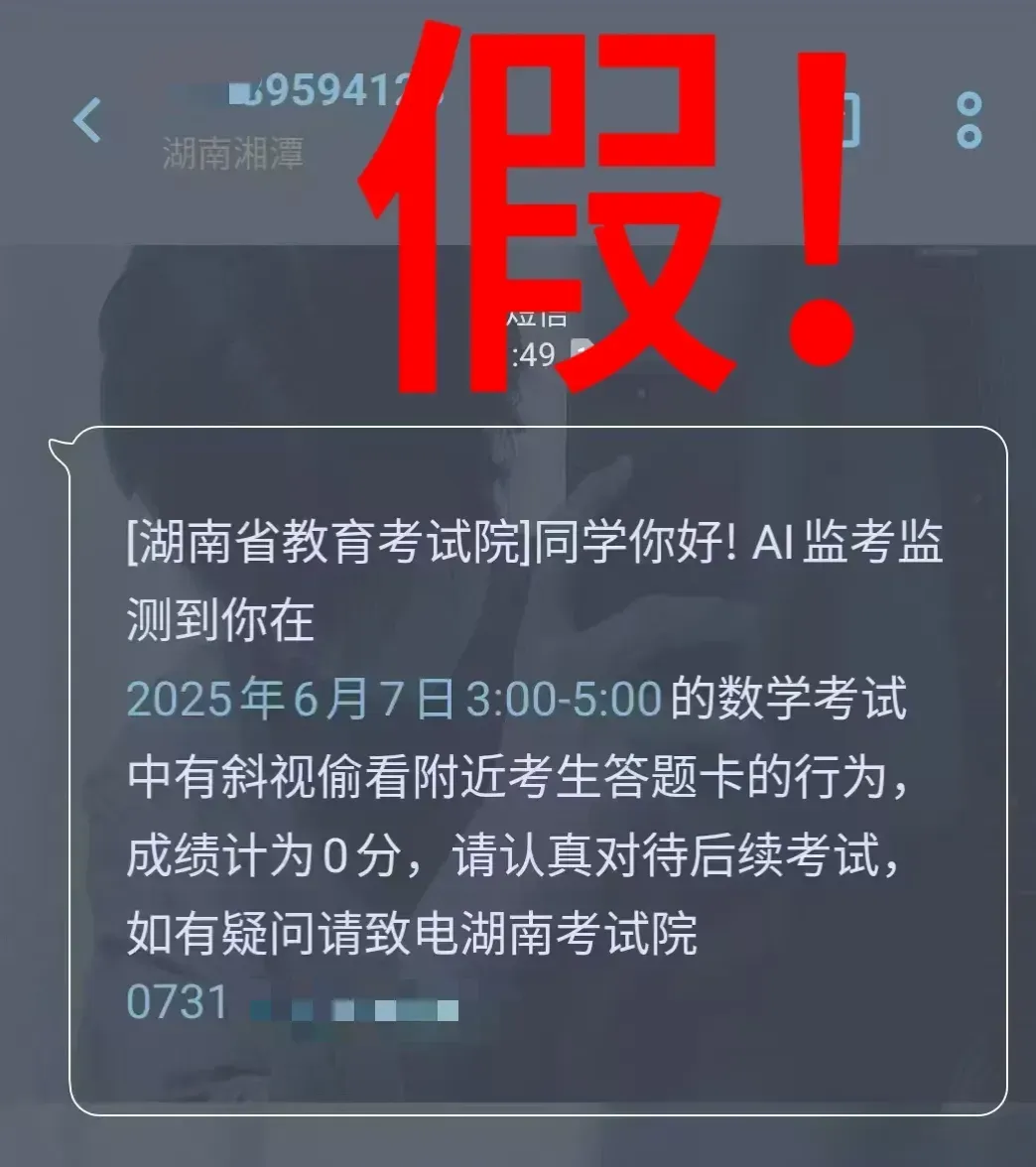 近日,部分湖南省高考考生收到 所谓“湖南省教育考试院”短信 称其在考试中被AI监考 发现有作弊行为 成绩记为0分